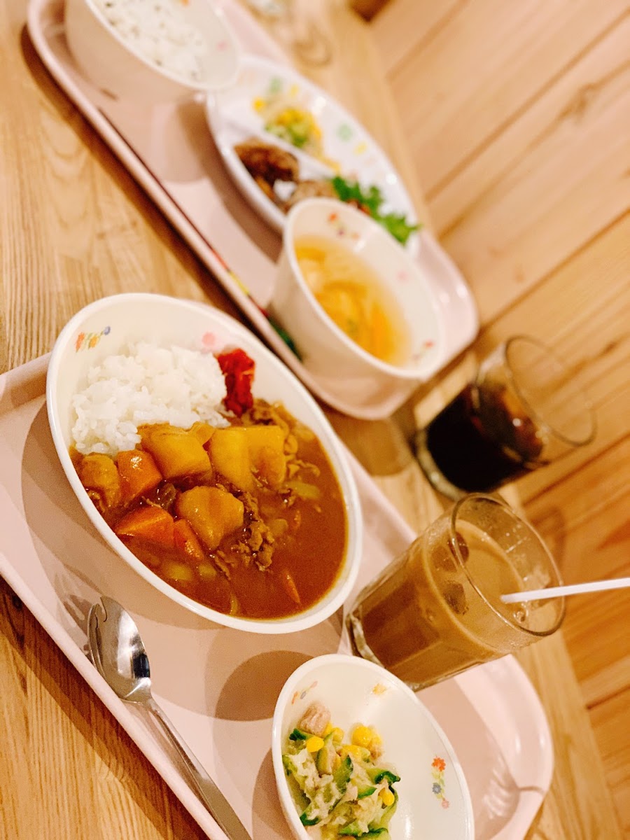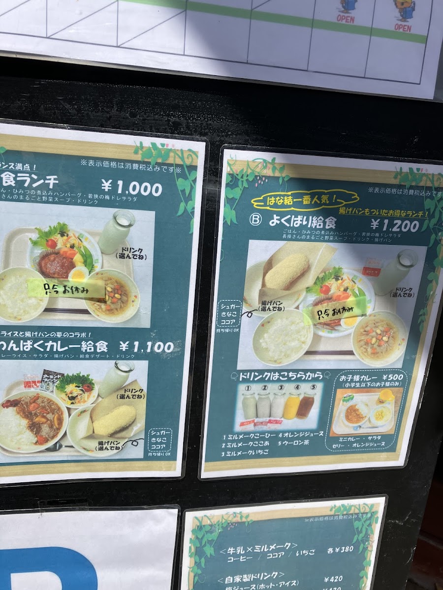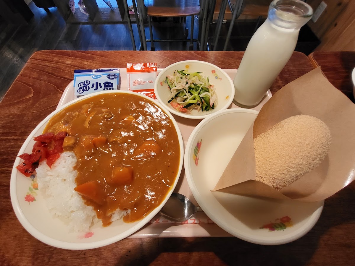 The menu is simple yet enticing, featuring the crowd-favorite 給食ランチ (School Lunch) — a well-balanced meal that includes rice, a secret-combination hamburger, Wakasa’s special plum dressing salad, and a wholesome vegetable soup, all served in retro school lunch trays. For just JP¥1,000, you will also receive a refreshing milk bottle drink to accompany the meal, making it a complete experience reminiscent of simpler times.